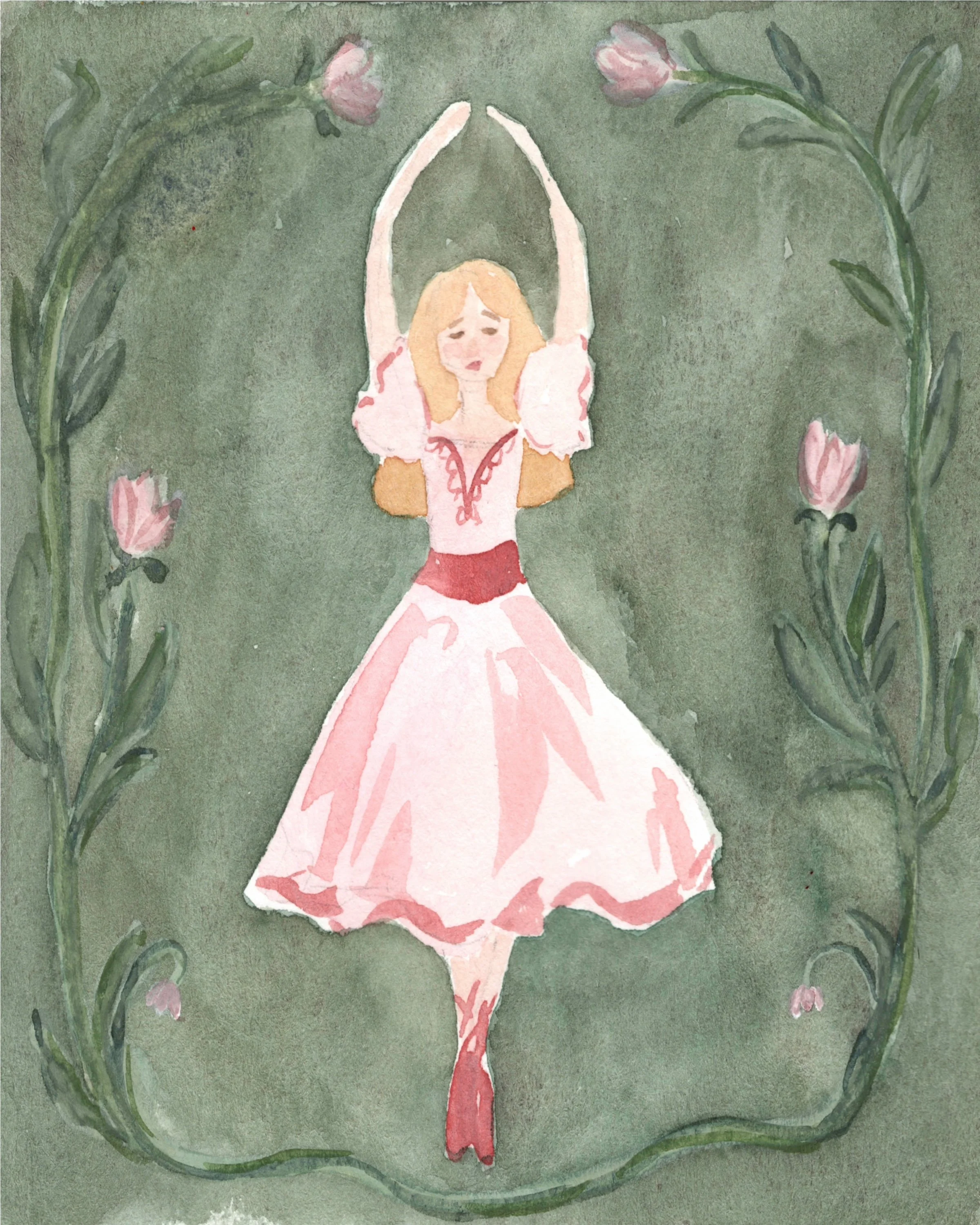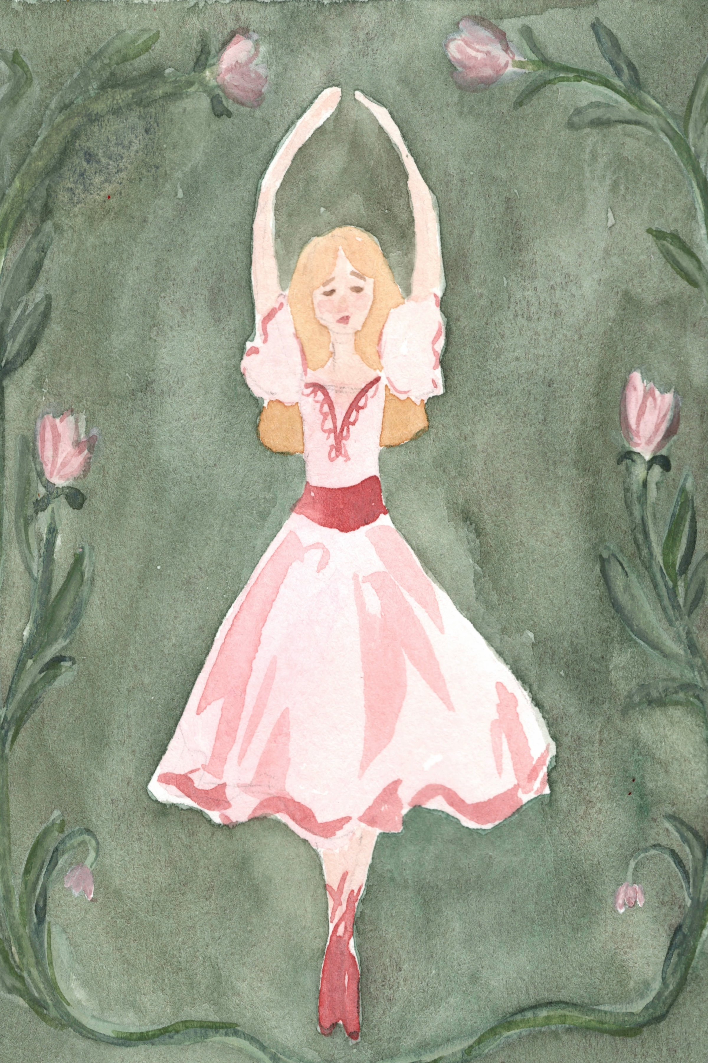 Inspired by the beloved nutcracker ballet, this emotive watercolor painting portrays a ballerina and her soldier (nutcracker). This delicate piece comes in a 4×5 inch antique gold frame.